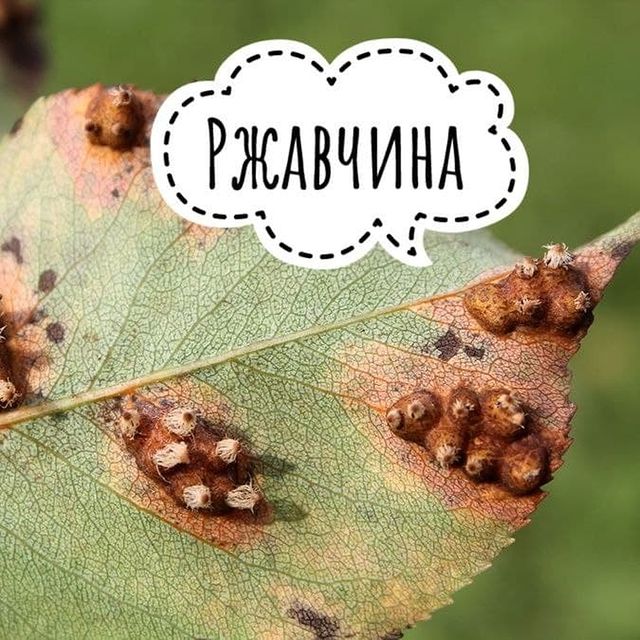 В июне ржавчина начинает проявлятся виде оранжевых пятен на листьях, на обратной стороне листа образуются наросты. В запущенноых случаях могут поражаться побеги и плоды, в совсем запущенных дерево может погибнуть.