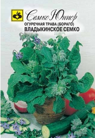 Сорт однолетний. Период от всходов до уборки на зелень 40-45 дней. Розетка листьев полураскидистая, лист крупный, овальный, сильноопушенный. Стебель прямостоячий, ветвистый, толстый, с опушением. Цветки крупные, голубой окраски. Цветёт с июня по сентябрь. Растения нетребовательно к условиям выращивания. Молодые листья обладают запахом огурца, их употребляют до появления цветочного стебля. Растение очень декоративно и является прекрасным медоносом. Сорт холодостойкий. Свежие, яркие цветки, засыпанные сахаром - лакомство для детей. Посев семенами ранней весной или под зиму до наступления устойчивых заморозков. Схема посадки 15x25 см. Глубина заделки семян 1,5-2 см. В 1 г - 60-70 семян.