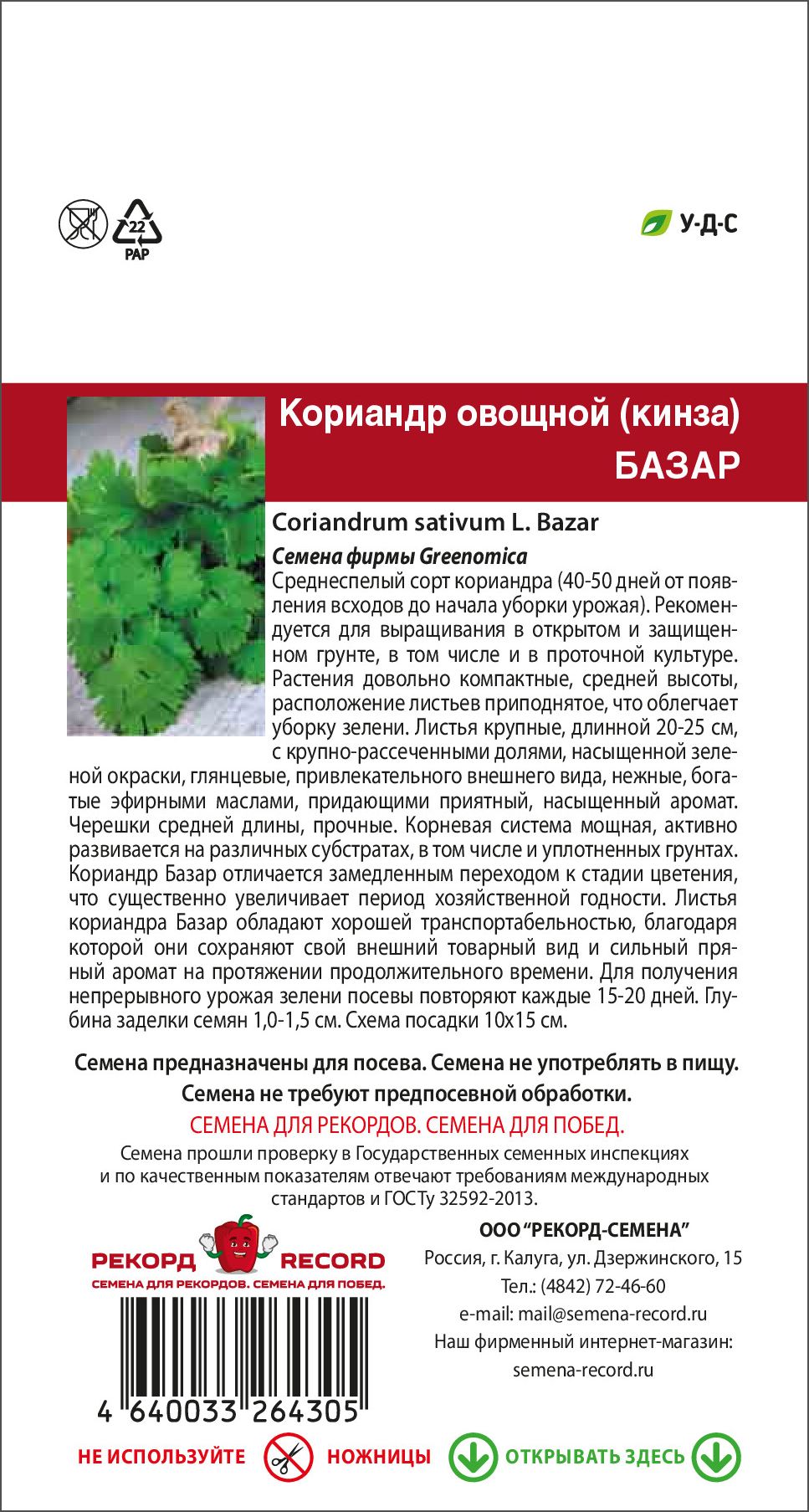 среднеспелый сорт кориандра (40-50 дней от появления всходов до начала уборки урожая). Рекомендуется для выращивания в открытом и защищенном грунте, в том числе и в проточной культуре. Растения довольно компактные, средней высоты, расположение листьев приподнятое, что облегчает уборку зелени. Листья крупные, длинной 20-25 см, с крупно-рассеченными долями, насыщенной зеленой окраски, глянцевые, привлекательного внешнего вида, нежные, богатые эфирными маслами, придающими приятный, насыщенный аромат. Черешки средней длины, прочные. Корневая система мощная, активно развивается на различных субстратах, в том числе и уплотненных грунтах. Кориандр Базар отличается замедленным переходом к стадии цветения, что существенно увеличивает период хозяйственной годности. Листья кориандра Базар обладают хорошей транспортабельностью, благодаря которой они сохраняют свой внешний товарный вид и сильный пряный аромат на протяжении продолжительного времени. Для получения непрерывного урожая зелени посевы повторяют каждые 15-20 дней. Глубина заделки семян 1,0-1,5 см. Схема посадки 10*15 см.