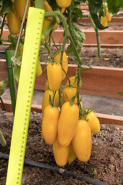 Сорт ультраранний, полудетерминантный. От всходов до сбора первого урожая 90-96 дней. Первое соцветие закладывается над 9-11 листом, последующие через 2-3. Окраска плодов насыщенного желто-оранжевого цвета с желтыми полосками, в которых заметны вкрапления розового цвета. Плоды средней массой 80г, двухкамерные, цилиндрической формы с бугорчатой поверхностью и сильно оттянутым тонким острым носиком, склоненнным в сторону. Вкус плодов очень хороший. Мякоть тает во рту, семенные камеры небольшие. Растение желательно формировать в 2-3 стебля, но допустимо формирование до 5 стеблей. Так же допустима загущенная посадка растений до 5 растений/м.кв. Сорт универсальный и хорошо подходит для приготовления самых разнообразных блюд, консервации и приготовления необычного по цвету томатного сока. Устойчив к основным заболеваниям томатов. Плотность посадки 3-3,5 растения/м.кв. Урожайность около 5кг с одного растения. Сорт взят из коллекции Татьяны Витальевны Щедриной "Урожайный Огород".