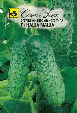 Огурец Наша Маша F1 - ранний партенокарпический гибрид женского типа цветения, рекомендуемый для выращивания в пленочных теплицах, парниках и открытом грунте. От всходов до начала плодоношения 38–42 дня. Растение среднерослое 1,5–2,0 м. Огурец плотный, темно-зеленый с короткими продольными размытыми полосами до 1/3 длины плода, среднебугорчатый, цилиндрический, длиной 8–10 см, массой 80–100 г, бурошипый, с простым опушением, генетически без горечи. Обладает слабой способностью к образованию пасынков. Вкусовые качества свежих и консервированных плодов высокие. Рекомендуется для выращивания в открытом грунте и пленочных теплицах. Урожайность 12–15 кг/м2.