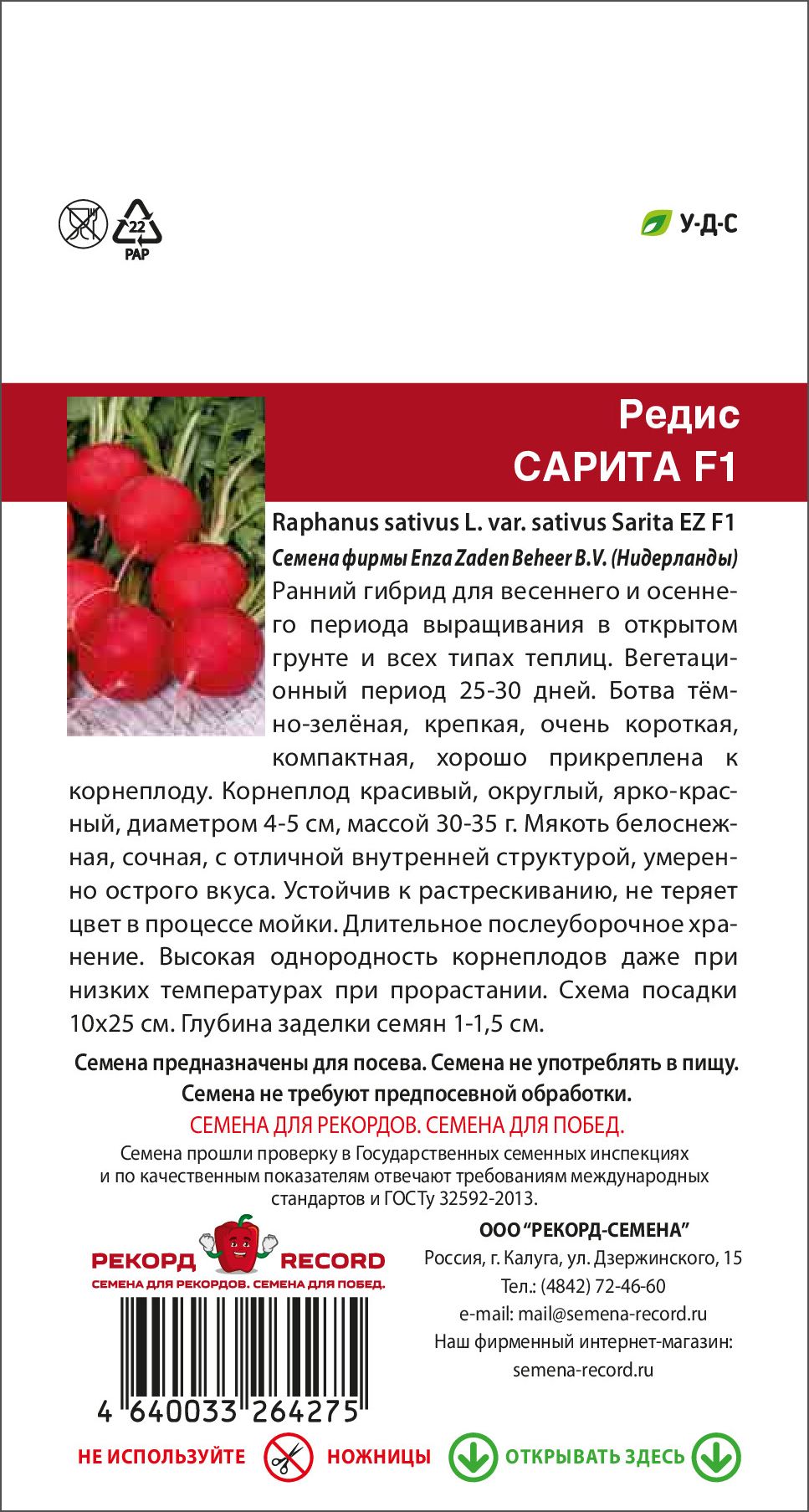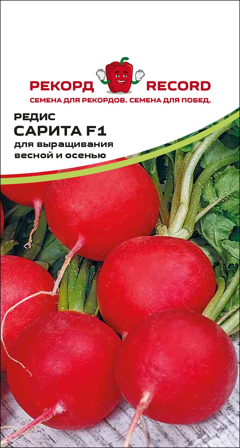 Ранний гибрид для весеннего и осеннего периода выращивания в открытом грунте и всех типах теплиц. Вегетационный период 25-30 дней. Ботва тёмно-зелёная, крепкая, очень короткая, компактная, хорошо прикреплена к корнеплоду. Корнеплод красивый, округлый, ярко-красный, диаметром 4-5 см, массой 30-35 гр. Мякоть белоснежная, сочная, с отличной внутренней структурой, умеренно острого вкуса. Устойчив к растрескиванию, не теряет цвет в процессе мойки. Длительное послеуборочное хранение. Высокая однородность корнеплодов даже при низких температурах при прорастании.